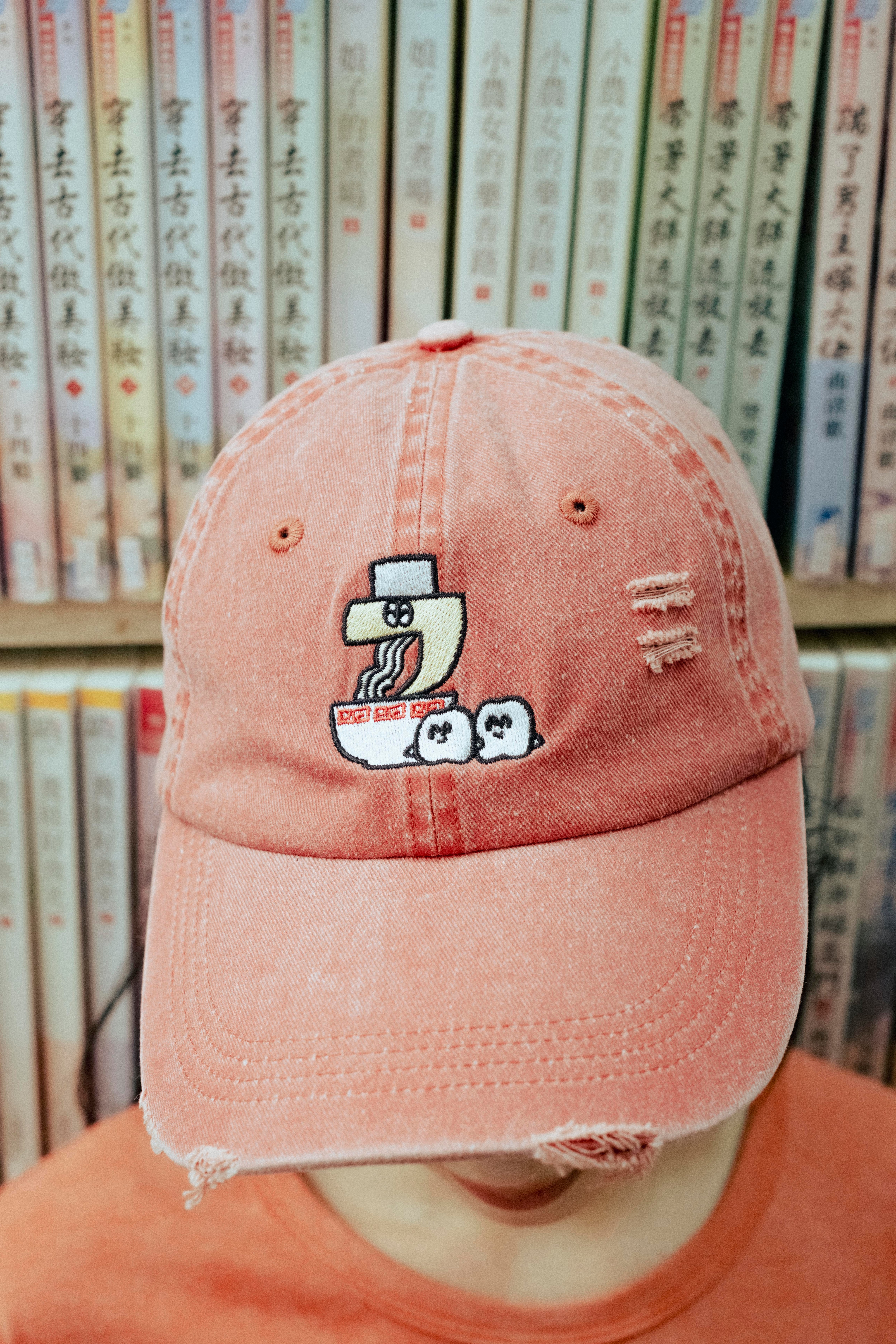 歯のマンガが台湾のアパレルメーカー拉麺探検隊とコラボしたキャップです。ラのキャラクターがラーメンをすするキャップです。