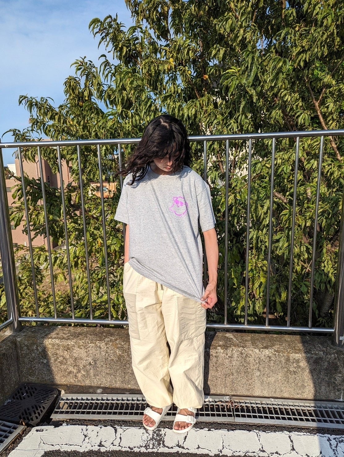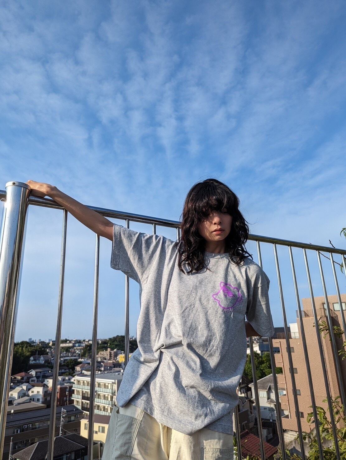 ビーチで佇む歯のTシャツのです。ボディの色はグレーです。プリントは紫。